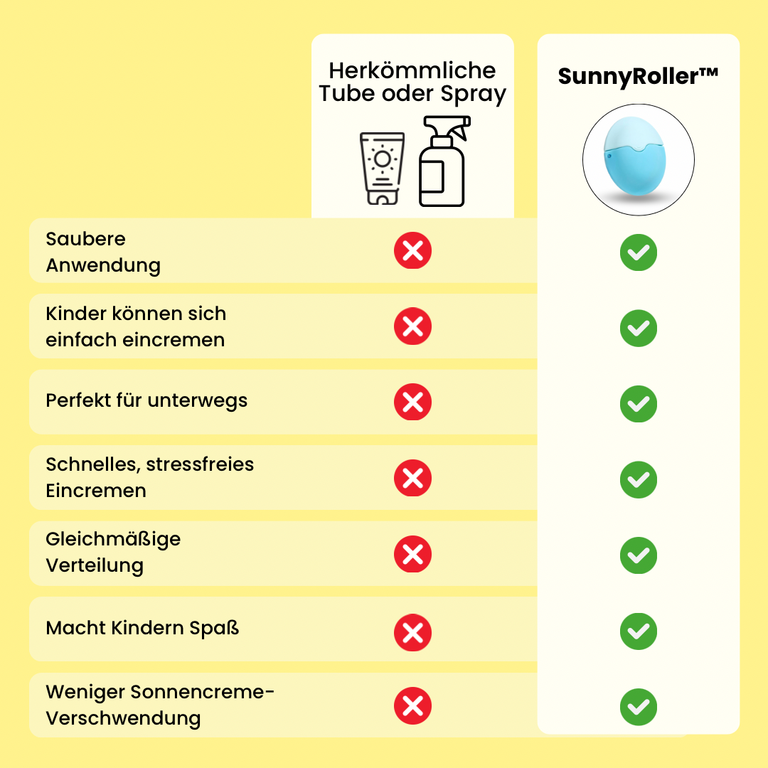 Anders als bei normalen Sonnencremetuben, die oft kleckern und ungleichmäßig sind, sorgt der SunnyRoller™ mit seinem Rollerball und Schwamm für sauberes, gleichmäßiges Eincremen – ganz ohne Chaos und klebrige Hände.